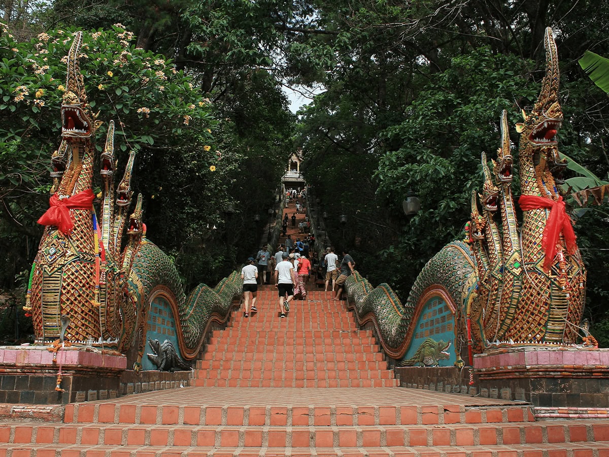 Climb the iconic Naga staircase to pay respect to Wat Phra That Doi Suthep, Chiang Mai.