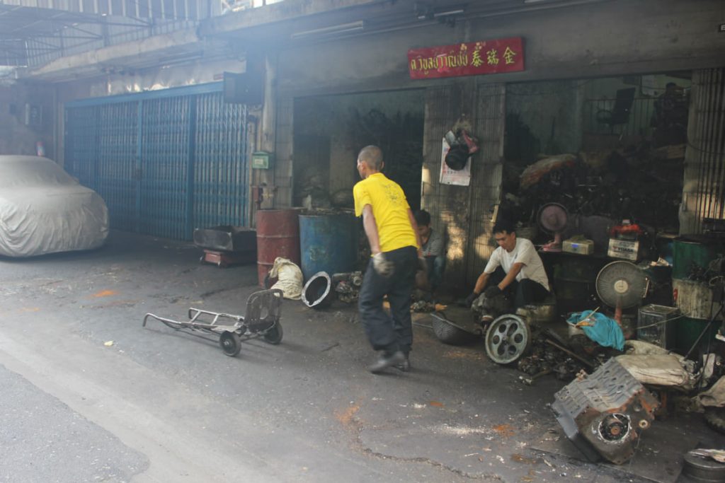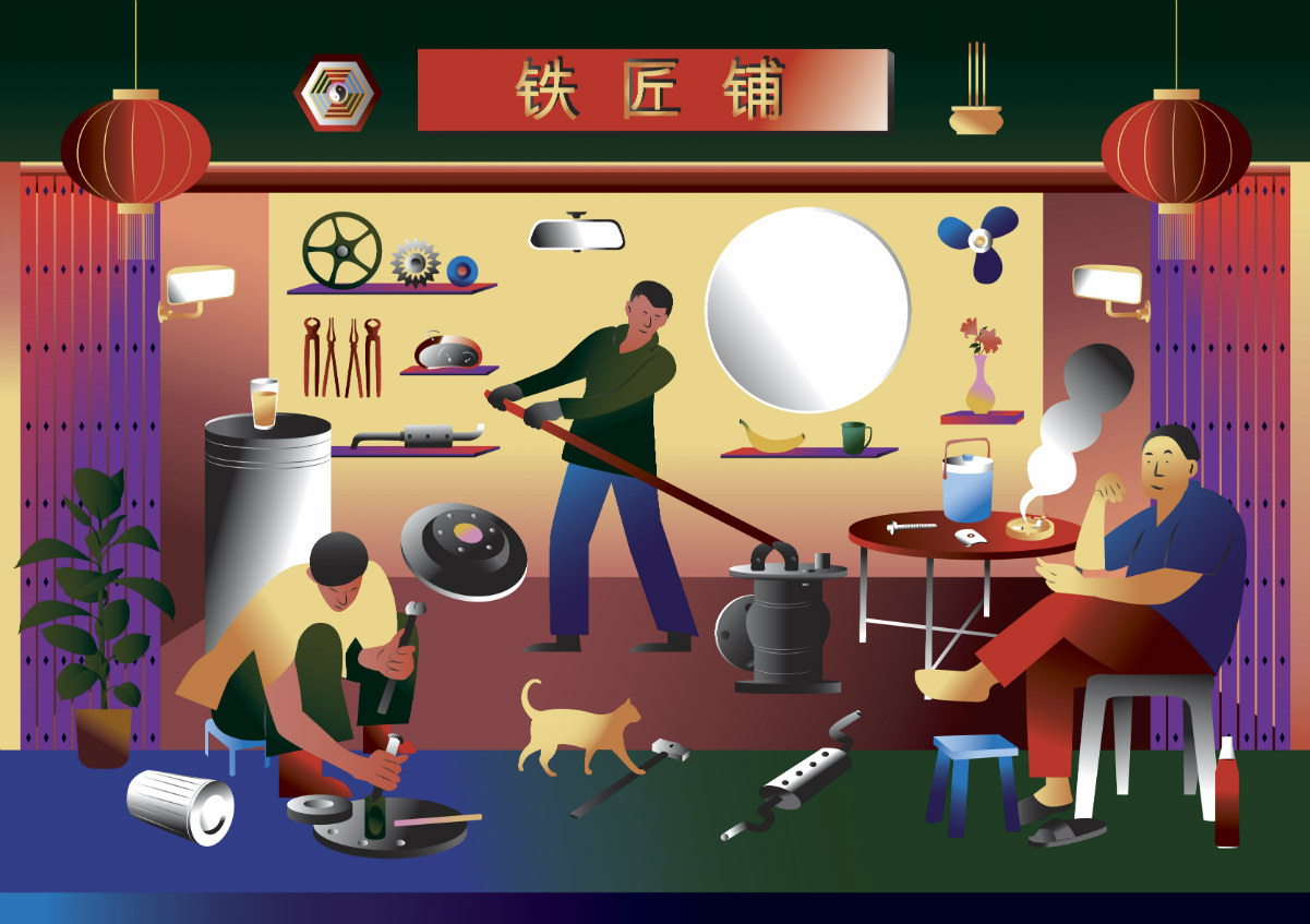 หนึ่งในอาชีพดั้งเดิมของชุมชนตลาดน้อยคือ การตีเหล็ก เราจึงจะได้เห็นชิ้นส่วนเครื่องยนต์อยู่ตามรายทางของตลาดน้อย รู้สึกสนใจ เพราะเป็นการ custom เหลือเป็นรูปทรงต่างๆ ให้สามารถนำไปใช้แทนอะไหล่ได้ จึงวาดฉากของการจำลองโรงกลึงในแบบฉบับของตัวเอง มีของประกอบฉากที่บอกเล่าถึงวิถีชีวิตของคนจีน เช่น กระจกเหลี่ยม กระถางธูปเทียน โคมแดง โดยใช้เทคนิคสีแบบเกรเดี้ยนในการวาด เพื่อแสดงถึงความแวววาวของเหล็ก รวมถึงสีสันสดใสที่ตั้งใจให้ภาพดูโมเดิร์นและมีความสนุกสนาน